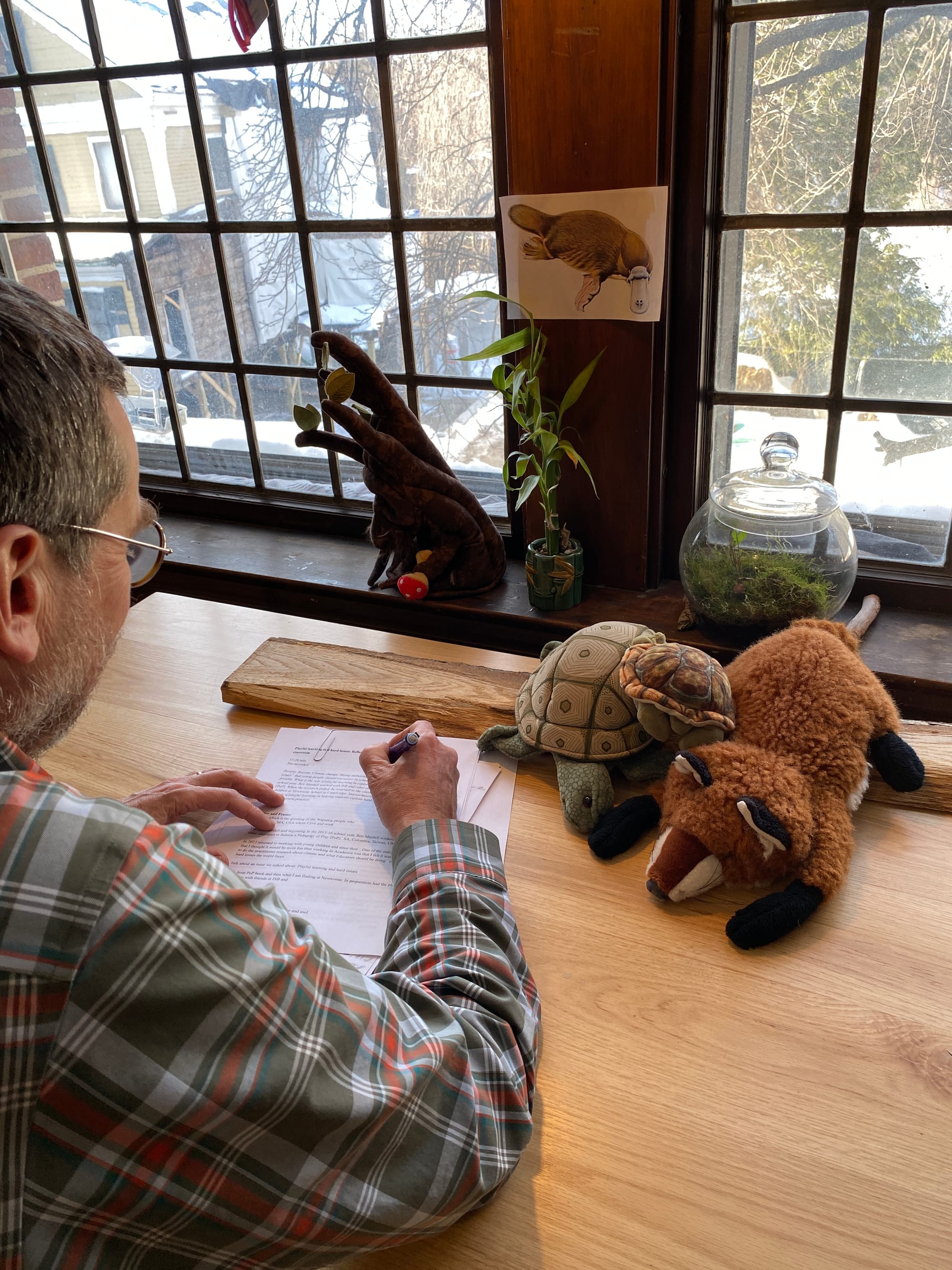 At Newtowne School, Ben began two and half years ago as the studio teacher with the goals of fostering children’s skills and dispositions to be improvisational and to promote their connections to the rest of nature without a pre-planned curriculum to implement. Rather, he tried things out. The Critter Count and Critter of the Month connected with children and families, and so continue. A towering tree outside his studio window failed to capture the interest of the students, and so an imagined in-depth investigation was abandoned. Building on lessons from a trip to Australia, he and colleagues are currently partnering with Annawan Weeden to infuse the curriculum with a Native American perspective.