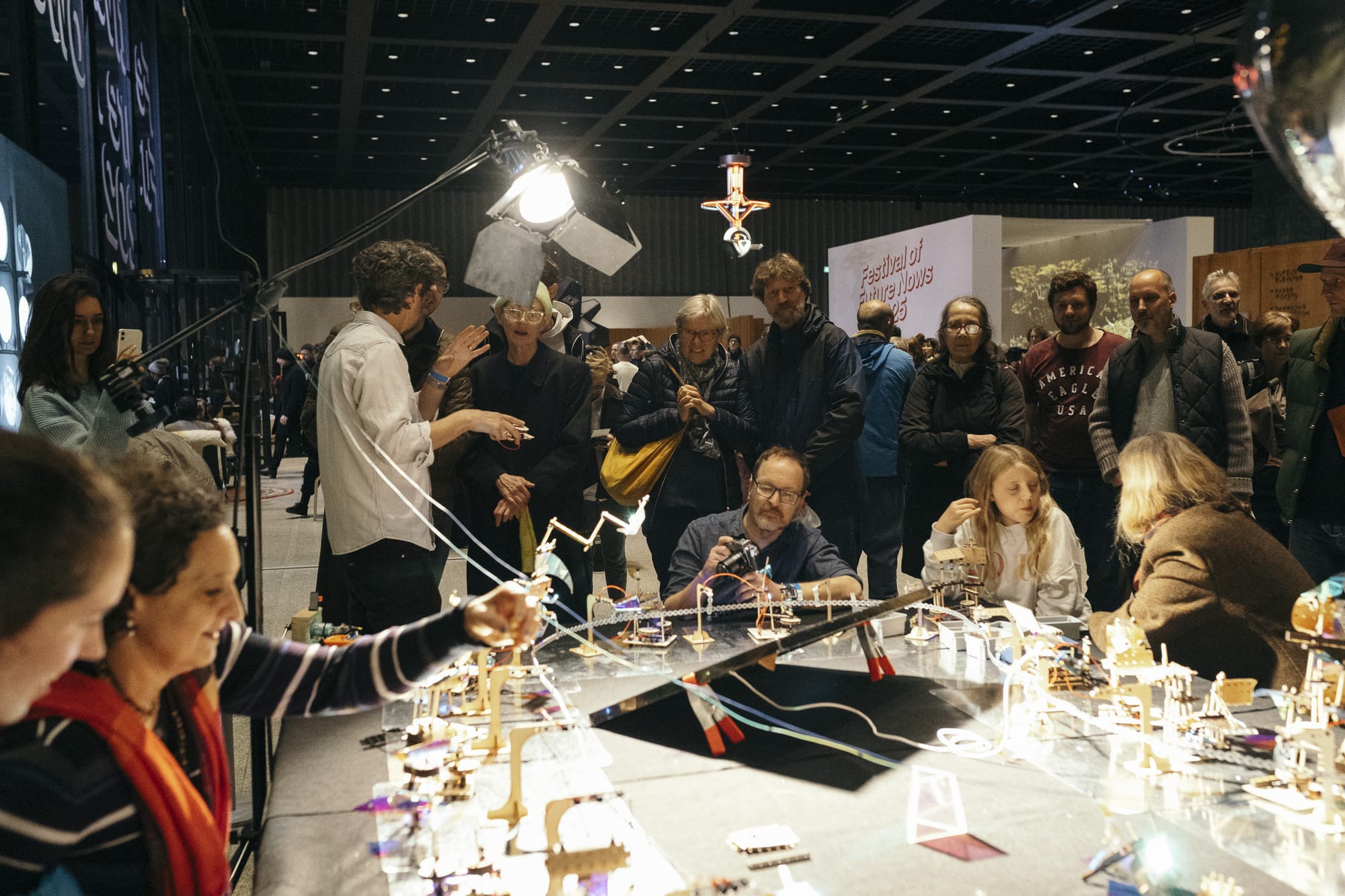 Solarpunk Futures debuted at the Festival of Future Nows at the Neue Nationale Gallery in Berlin, with the artist Andrew Amondson acting as creative producer and co-facilitator, and contributing to the design. It functions both as a collective artwork and a creative learning experience that interested people are invited to drop-in and try. Over the course of two days, around 100 people between the ages of 5 and 85 sat down to build projects, and over 20,000 viewed the collective artwork as it emerged.