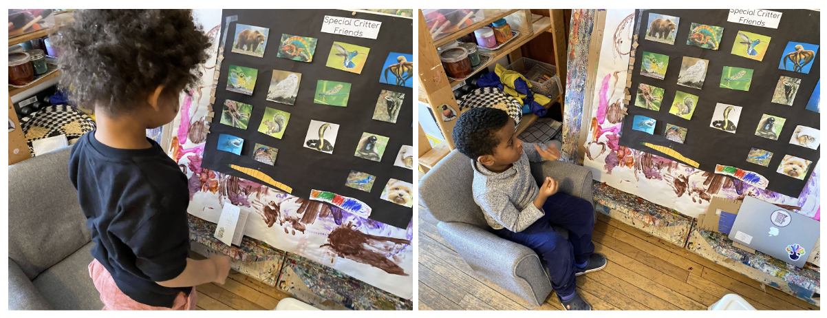 To introduce the idea of Special Critter Friends, when the children came to the studio in small groups they encountered a photo of Lyra, the protagonist of the Dark Materials story, with her daemon Pan. I explained that despite their differences (e.g., Lyra is big, Pan is small) they are friends and because of their differences they complement each other (e.g., Lyra can get things that are high up and Pan can go into small spaces).